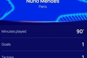 本场比赛努诺-门德斯发挥出色,传射建功,7次抢回球权,跑动距离9.6km,赛后他也当选欧冠官方评选出的本场最佳球员。